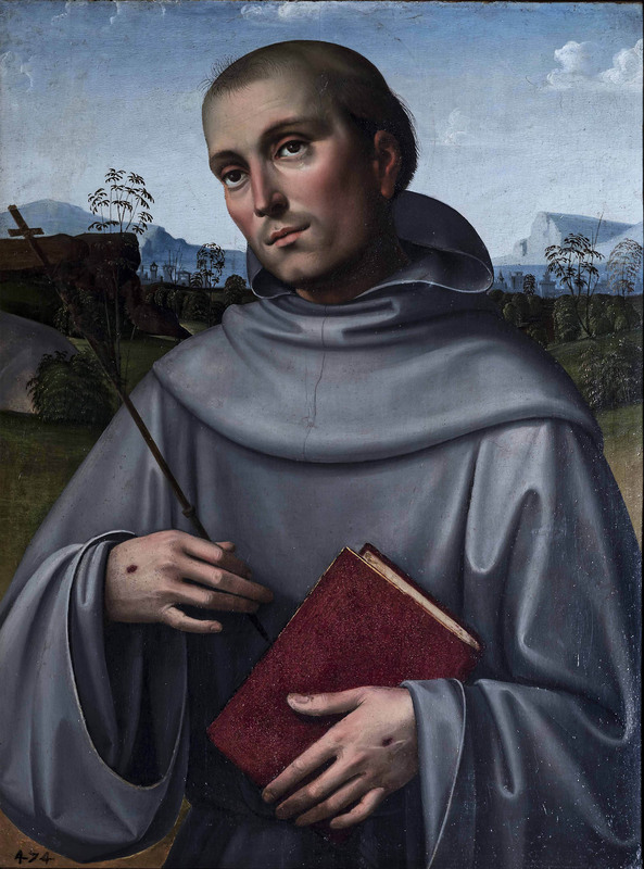 A certain amount of confusion regarding the artist has surrounded the painting ever since the first inventory mention in 1790, when a ‘St Francis by Pietro Perugino’ was recorded (Della Pergola 1955, p. 38). While the fideicommissary list of 1833 correctly changed the attribution in favour of Francesco Francia, it was the title of the subject, recognised as St Anthony of Padua, that was altered. An error justified by the presence of common attributes such as the small cross and the book, as well as the difficulty, in the past, of being able to see the characteristic stigmata of St Francis clearly. Credit is due to Giacomo Alberto Calogero, whose recent paper traced the attributional history of the work (Calogero 2019, p. 87). After Cavalcaselle, who suggested that the painting was the work of Giacomo Raibolini, the opinion of Adolfo Venturi was crucial (1890, p. 293). He recalled how ‘beautiful is the portrait thanks to the brush of Marco Meloni, which can be admired in the Galleria Borghese in Rome. In the Galleria Borghese catalogue, it is said that the painting does indeed represent St Francis; but wrongly, since the absence of the Stigmata and the presence instead of the characteristic symbols [...] fully justify our identification’ (A. Venturi 1893, p. 63; Gardner 1911, p. 195). Refutation would only come after the restoration work conducted by Vittorio Facchinetti in 1925, in which traces of the stigmata on the hands clearly emerged. A convincing opinion in support of Francia was expressed by Berenson (1907, p. 223), who steered Venturi’s opinion back into Francia’s orbit, assigning it to Giacomo Raibolini, with Roberto Longhi also later agreeing ([1928] 1967, I, p. 335, no. 57). After further endorsement (Berenson 1932 p. 209 and 1936 p. 179), the attribution to Francia was accepted by later critics (De Rinaldis 1939, p. 45; Della Pergola 1955, p. 38, no. 49). According to Calogero (cit.), the painting in the collection can be defined as ‘an excellent example of the turning point at which Francia embraced whole-heartedly Perugino’s influence at the turn of the century: an espousal that provided the right blend of optical clarity and gentleness, pushed to the point of excess’, thus drawing a close comparison between the figure of the Saint and the St Jerome in the Assumption of the Virgin in the Accademia Gallery. With regard to the dating of the work, the comparison drawn by Simonetta Stagni with the St Francis in the altarpiece painted by Francia, dated 1500, in the Pinacoteca di Bologna was of fundamental importance (Stagni 1986, pp. 2, 9, 13). This suggestion was endorsed by later critics (Negro, Roio, 1988, pp. 150-151).
