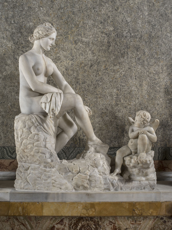 This sculpture is composed of elements of differing provenances, quite likely assembled with the intention of creating a pendant to the group of Leda and the Swan placed against the opposite wall of the room (inv. LXII). In 1650, Manilli recalled a group set atop a column ‘in the upper order of the facade’ in the second enclosure of the garden, composed of a ‘seated Venus with a hand on one leg which is raised’, plausibly identifiable with this work (p. 153). In 1700, Montelatici also mentioned a ‘Venus with one leg raised above the knee’ in the same location; he also mentioned a ‘small statue of a seated cherub’ (p. 301) in the Room of the Three Graces on the second floor. In 1832, Nibby indicated the group was already composed and in its present location in Room 1, and defined it ‘a statue of Venus in Parian marble, seated, in the act of drying herself’, considering it a ‘not despicable work’. He further notes that ‘the cherub watching with its smart eyes is extremely expressive’ (p. 65). In a study carried out in 1841, he also mentioned the presence of a frog (p. 915). Venturi and Giusti both used the same expression to describe the sculpture: ‘a group depicting Venus in the act of preening while Eros looks on’ (1893 p. 21; 1904 p. 21). Moreno considered the work a modern reworking composed of elements datable to the mid-second century CE based on Hellenistic models from different periods (2003, p. 159, no. 128).