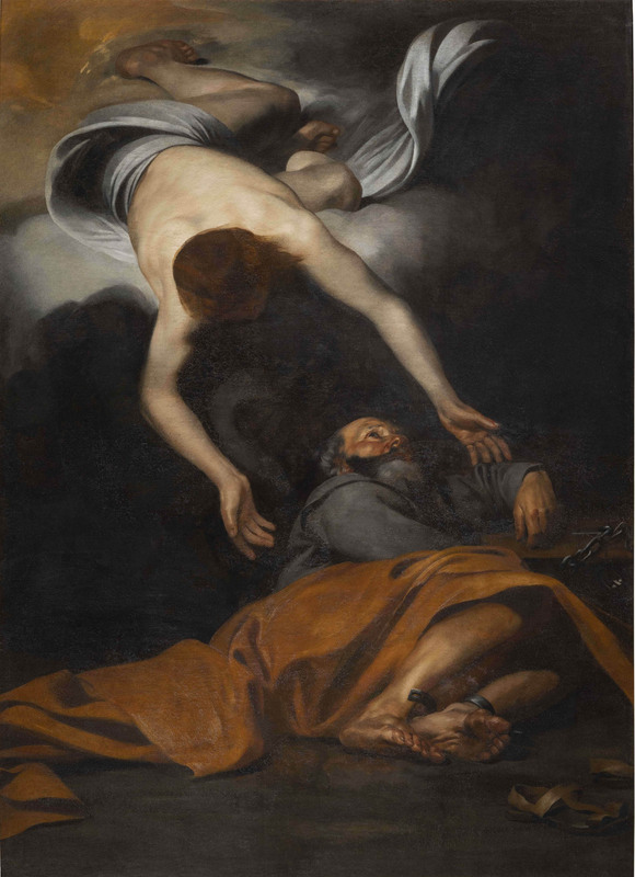 La tela, attribuita in passato al pittore ticinese Pier Francesco Mola, è stata recentemente restituita dalla critica a Jusepe de Ribera detto lo Spagnoletto, artista spagnolo noto come uno dei massimi protagonisti della pittura napoletana del Seicento. La tela, eseguita intorno al 1613-1614 circa, rappresenta l'apostolo Pietro che nel buio di una prigione dove è stato incatenato, viene visitato da un angelo che miracolosamente lo libererà dalla prigionia. La storia, tratta dagli Atti degli Apostoli (12:6), è stata qui trasposta con incredibile pathos e notevole maestria dal famoso pittore che, attraverso un uso sapiente del calore, è riuscito a rendere palpabili i soggetti ritratti.